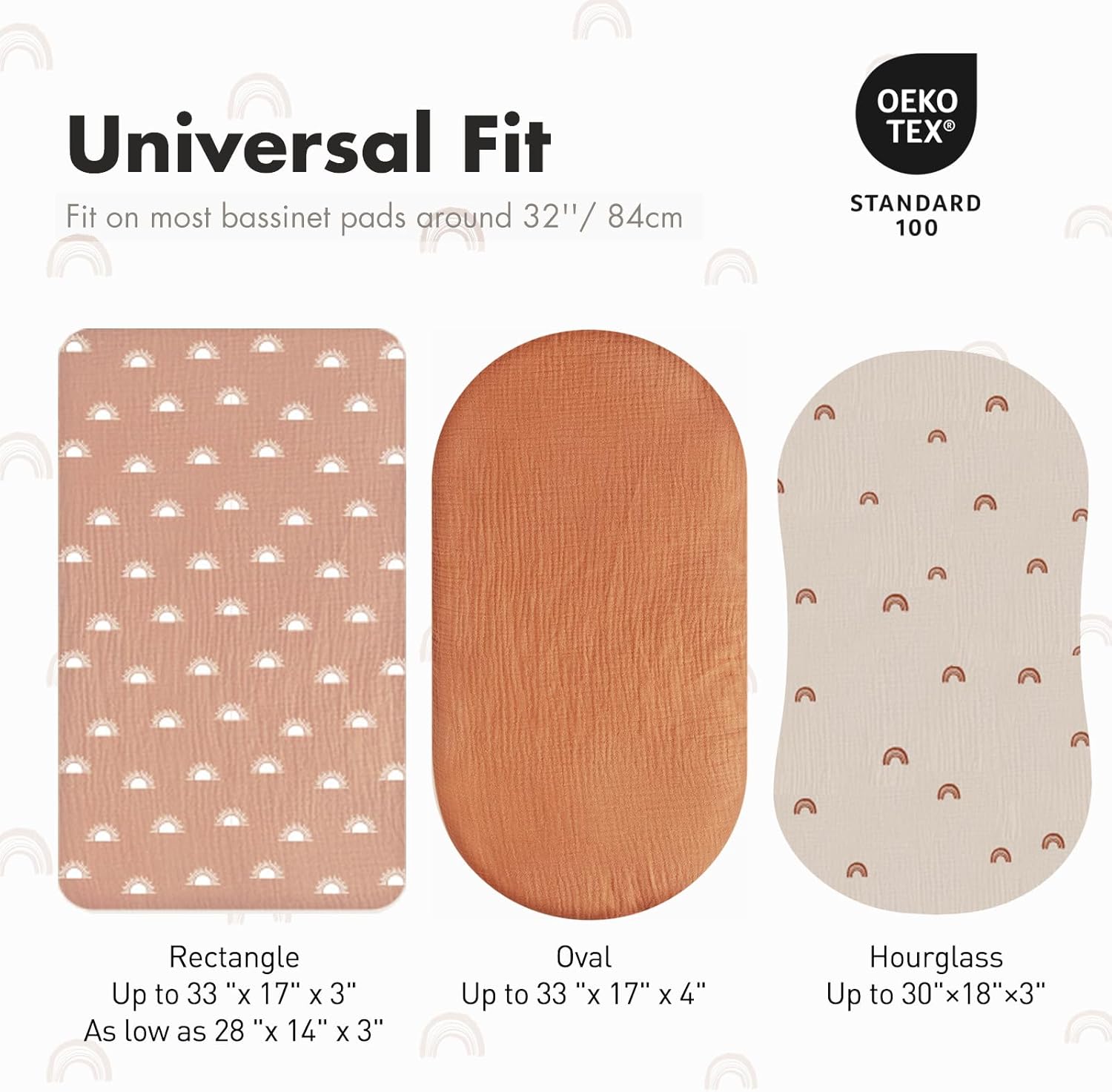 - ONE SIZE FITS ALL (33"x17"x4"): Designed for universal use, our bassinet sheets fit most bassinets, baby loungers, cradles, and co-sleepers. They accommodate standard, oval, round, rectangular, and hourglass-shaped mattresses. The elastic band provides a snug, secure fit while making sheet changes quick and easy