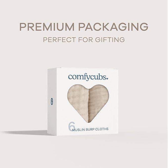 Comfy Cubs Muslin Burp Cloths 20" x 10", Pack of 6 - Large, 6-Layer, Ultra Absorbent 100% Cotton for Baby Drool and Messes - Soft, Safe & Gentle Baby Burp Cloths Set for Boys & Girls - Sand