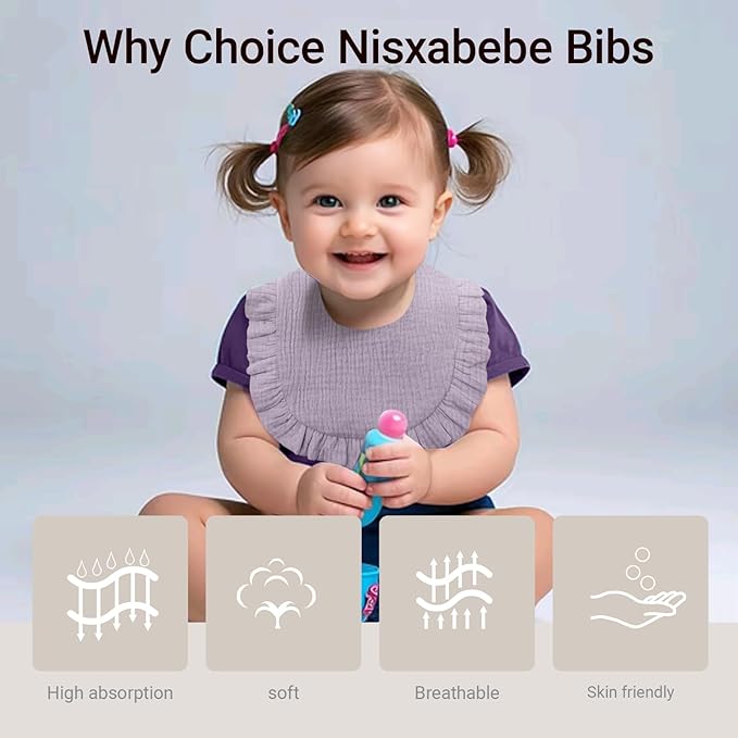 - Premium Comfort & Breathability:Nisxabebe Muslin Bibs crafted with 100% premium cotton 4-layer muslin fabric, our baby bibs provide unmatched softness and breathability for delicate skin.Thicker design locks in moisture during teething, drooling, or feeding, keeping your baby dry and irritation-free all day long.