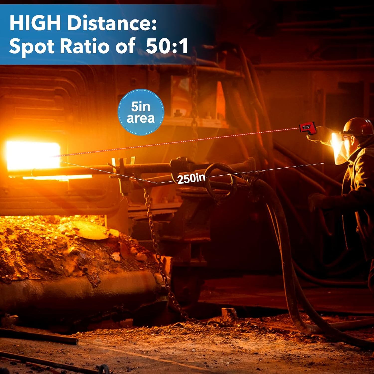 - 【Further Distance 50:1 + Dual Laser Point】With distance to spot ratio 50:1, you can measure high temperatures from a safe distance without getting too close to the heat source, ensuring both convenience and high safety. Dual non-contact digital lasers for instand targeting, allows you stand further from heat to measure high temperature. Instant capture hot spot and measure within 0.5 second only