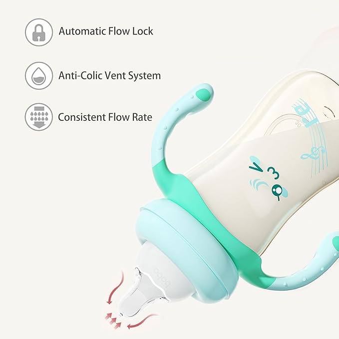 - The bottom of the nipple has intelligent pressure regulating valve, balance internal and external pressure, milk and air separation, to avoid the baby breathing too much air caused by colic flatulence.