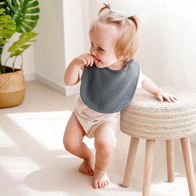 - DUAL-LAYER DESIGN FOR MAXIMUM ABSORBENCY: Crafted with a soft 100% cotton front and an absorbent polyester fleece back, these muslin bibs keep your baby dry throughout the day, whether during teething, feeding, or drooling moments