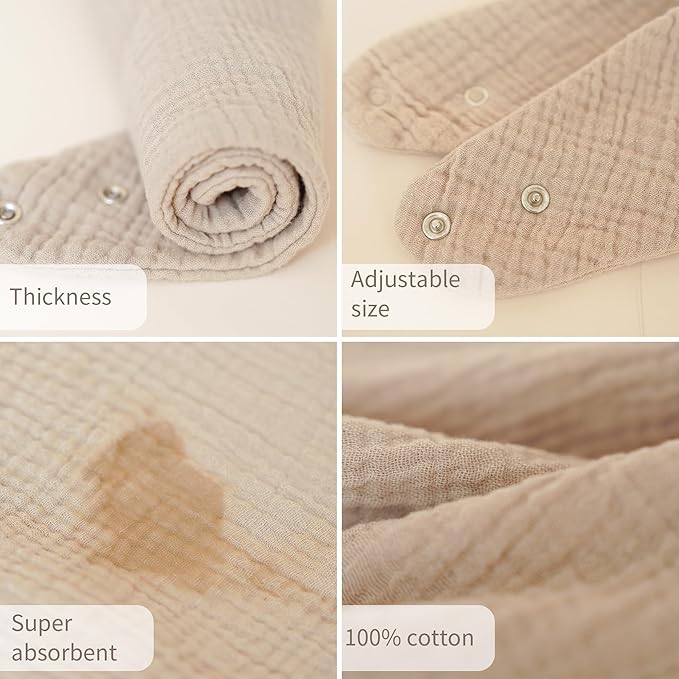- 100% COTTON FOR BABY’S COMFORT: Made from 100% double-layer muslin cotton, the muslin baby bibs provide unmatched softness and breathability, ensuring they’re gentle on your baby’s delicate skin while providing excellent absorbency to keep them dry all day