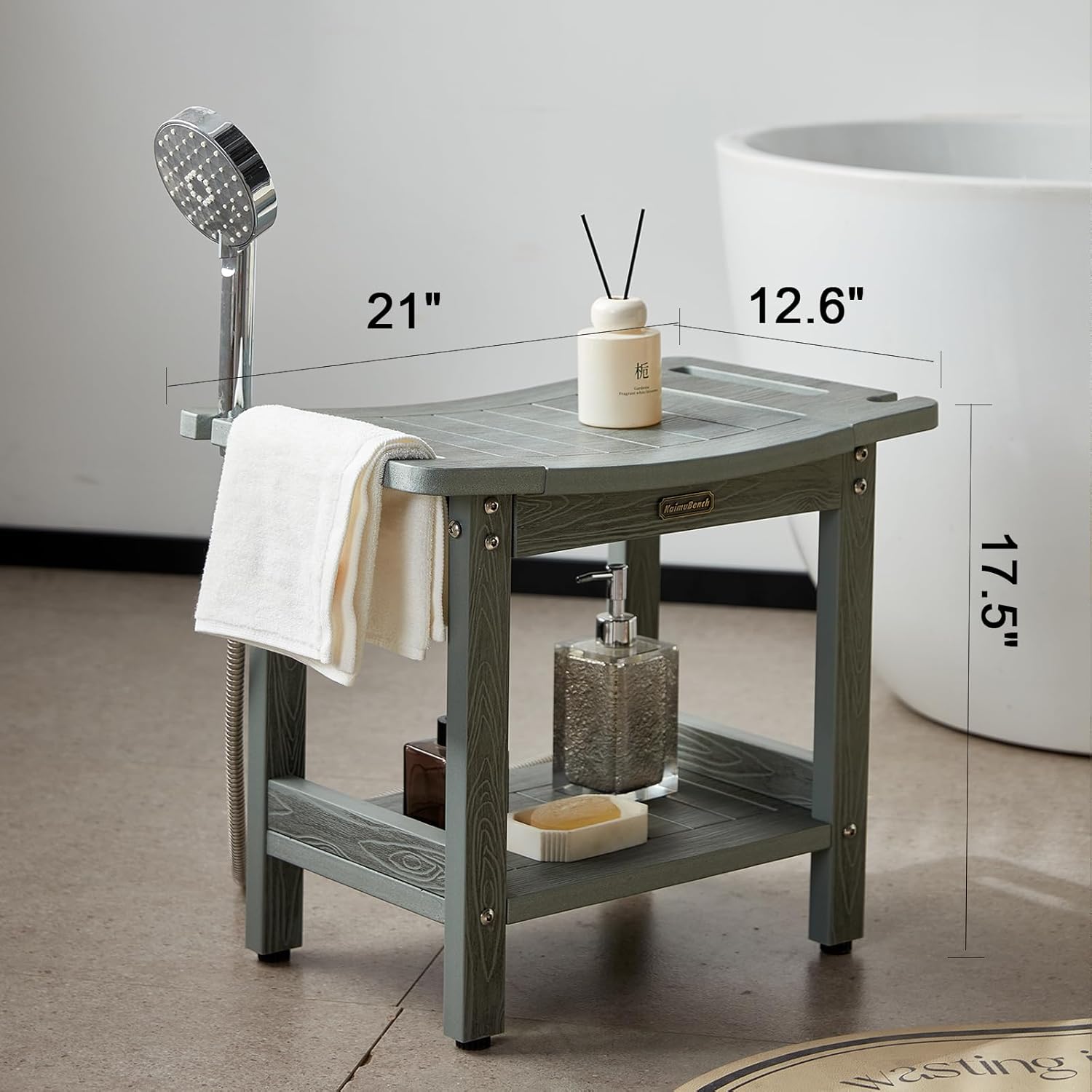 HDPS Shower Bench for Inside Shower, Gray Waterproof Shower Stool for Shaving Legs, Poly Lumber Shower Chair Seat with Handles & Shower Head Holder, Bathroom Shower Foot Rest Stool with Storage Shelf