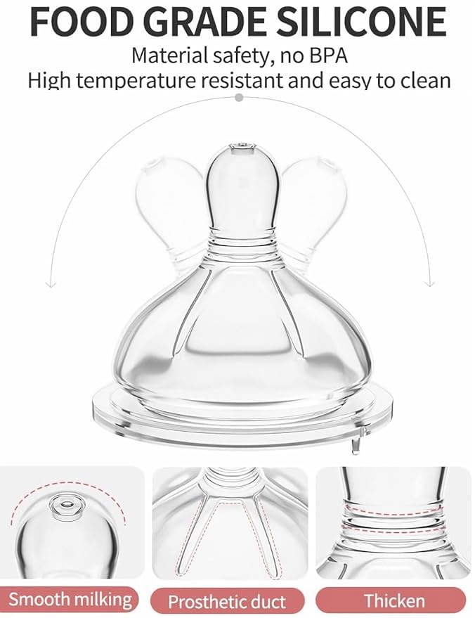 - ★Breastfeeding with breast-shaped nipple: With a wide breast shapes,the nipples mimics the shape and feel of a breast to make babies have a sense of satisfaction and security to ease the transition from breast to bottle; Made of food-grade silicone, the nipples made tens of thousands of pulling experiments and can protect baby’s gums well;