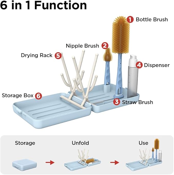 - Complete Cleaning Kit: This travel bottle brush set includes silicone bottle brush, nipple brush, straw brush, soap dispenser and foldable drying rack to thoroughly clean all baby bottles and accessories while on the go.