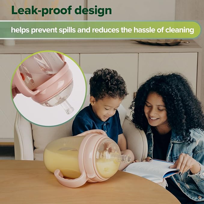 - Haakaa's design: 360° for easy sipping - a flexible stainless steel Haakaa weighted straw allows your baby to drink without tipping their head back. The leak-proof design helps prevent spills and reduces cleaning hassle. The wide Haakaa Bottle base adds stability, while the non-slip handle makes it easy to hold for tiny hands and facilitates successful movements to the mouth, encouraging the transition from bottle to open cup.