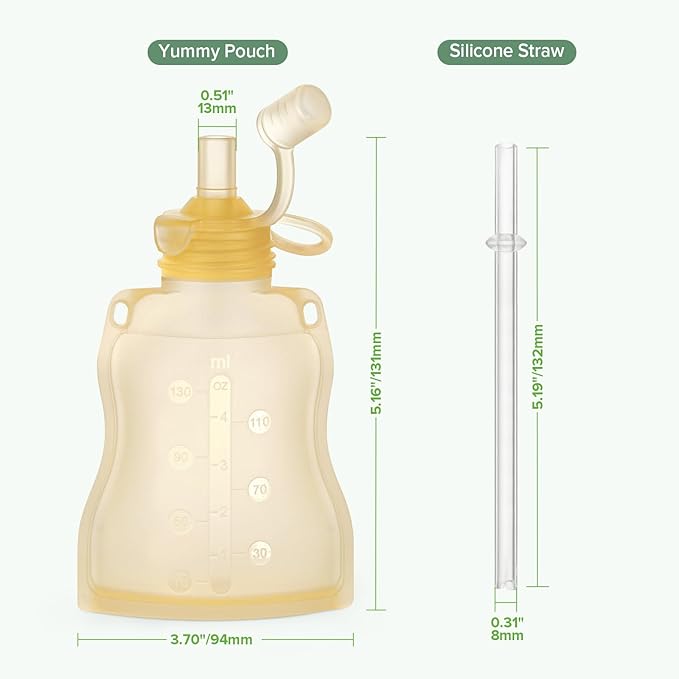 haakaa Baby Food Pouch Refillable Baby Squeeze Silicone Yummy Pouch, Soft Reusable Squeeze Storage Food Pouch for Kids Toddler,Home Made Food Puree,Smoothie Pouch Bag, 4oz, 4 Pack,6m+ (Yellow)