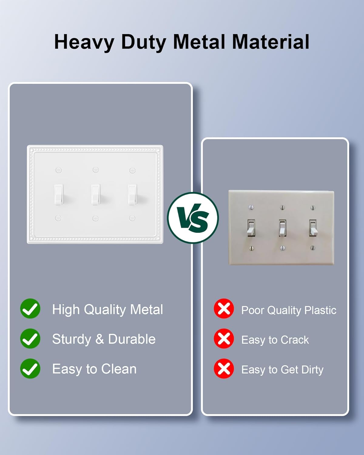 - Timelessly Elegant - The triple light switch plate cover features an exquisite crisp white finish with a stylish beaded border. Offering an inviting, comfortable feel to your home decor. Effortlessly blends practicality with a refined decorative accent and sophisticated charm.