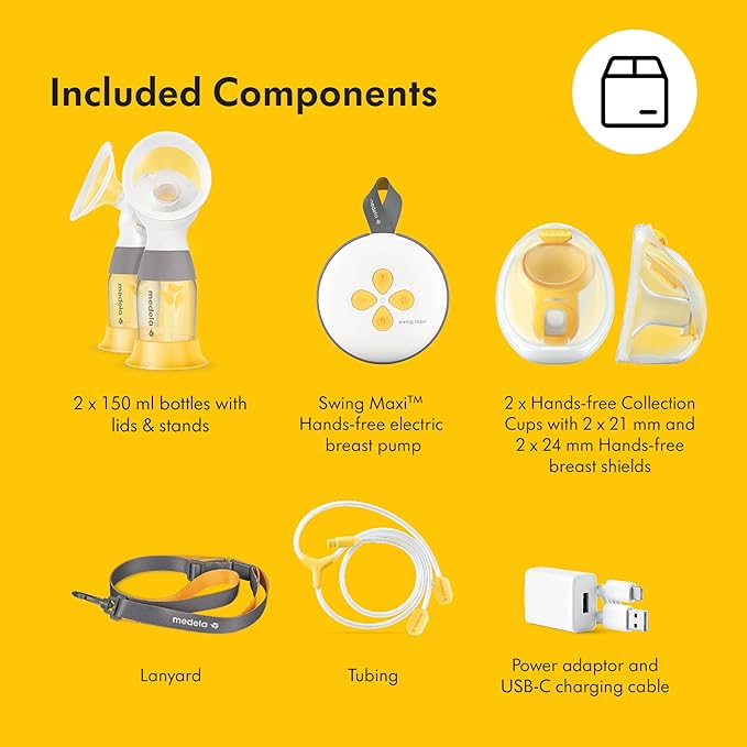 - Includes: (1) Medela Swing Maxi Double Electric Breast Pump, (2) Hands-Free Collection Cups, (2) PersonalFit Flex Breast Shields