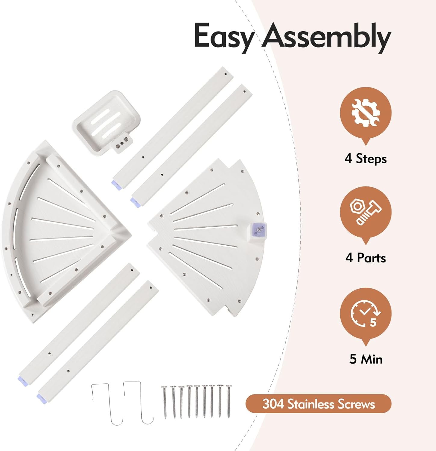 2-Tier Corner Shower Stool with Hooks & Soap Dish, HDPE Shower Bench for Shaving Legs, Wood-Like Shower Stool for Inside Shower with Non-Slip Foot Pads, Waterproof Shower Foot Rest (White)