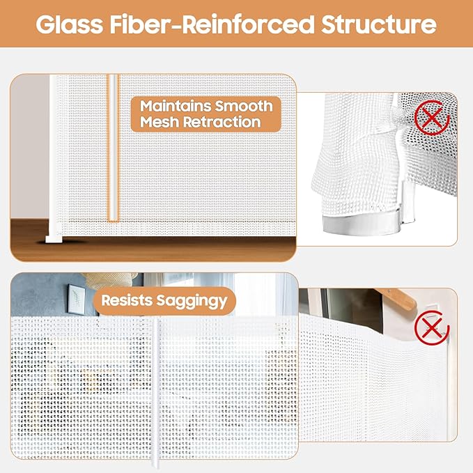 - 【Fiberglass Support】We have upgraded the retractable gate with fiberglass support strips, which prevent kids and pets from going under the mesh and reduce wrinkling. The mesh expands smoothly without getting stuck, making it effortless to use.