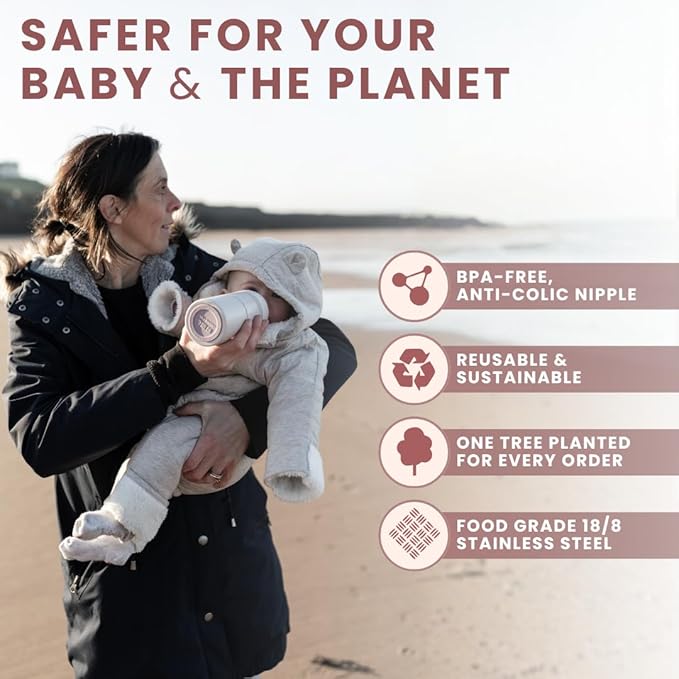 - ECO-FRIENDLY & SAFE FOR YOUR BABY - Our bottle is made from food-grade 18/8 stainless steel and features a BPA free, PVA free, and toxin-free nipple, ensuring the utmost safety for your baby. We use recyclable packaging and support reforestation by planting one tree for every product.