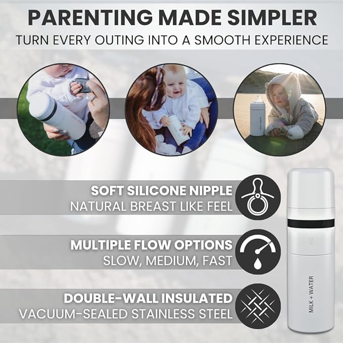 - KEEPS WATER WARM & FORMULA FRESH: MIX WHEN READY - The insulated stainless steel baby bottle is double vacuum-sealed to keep water warm up to 8 hours and formula fresh in a separate formula dispenser attached above. Simply twist to release the powder, then shake to mix, and feed your baby warm, fresh formula.