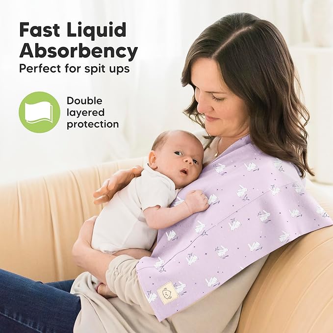 - Super Absorbent, Catches Liquid Well - These burping cloths for babies sits on your shoulder comfortably, and the thick organic cotton catches rolling liquid and spit ups well.
