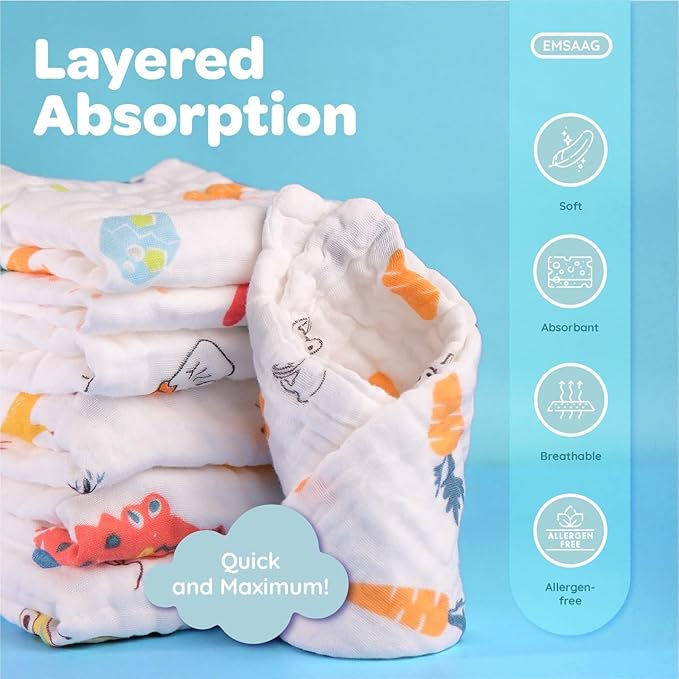 - Fast Drying, 6 Layer Thickness, Super Absorbent: These fibers don't retain moisture! They dry quickly, preventing irritation and discomfort. Our diapers are made of 6 layers of absorbent muslin cotton, which is thick and durable; they also utilize bubble technology and a fluffy structure design to achieve a 3D fluffy effect (because the baby towel is compressed for a long time, it will become fluffy after a few days of opening). Our diapers are super absorbent and soft, providing instant water absorption to keep your baby clean and dry.