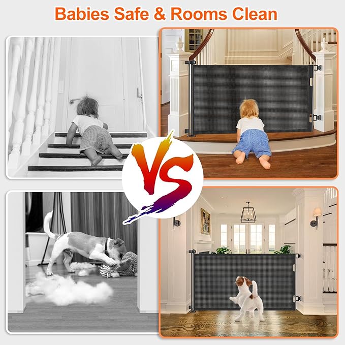 - Upgraded Design for Higher Safety: Unlike most retractable gates on the market, our safety dog gates for doorways comes with metal pull rings, which can be fixed on the floor to reduce wobbling , effectively prevent babies and dogs from crawling under the mesh gate. This baby gates can be used as an infant gate and a pet gate, providing a safe, closed off environment to play for your curious crawlers, keeping them away from dangers.