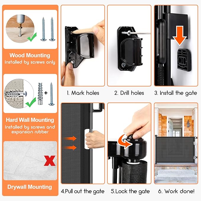 - Suitable for Indoor and Outdoor: Our retractable baby & dog gate can be installed on stairs, doorways, hallways, kitchens, decks, porches, garages, top and bottom of corridors, indoor and outdoor, and even extra-wide dog gates for the house. It's perfect for keeping children and pets safe, giving a large space for your little one to play, free mom’s hand. With this stair gate, you can have peace of mind knowing that your child or pet is always safety!