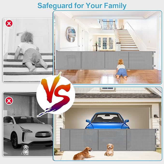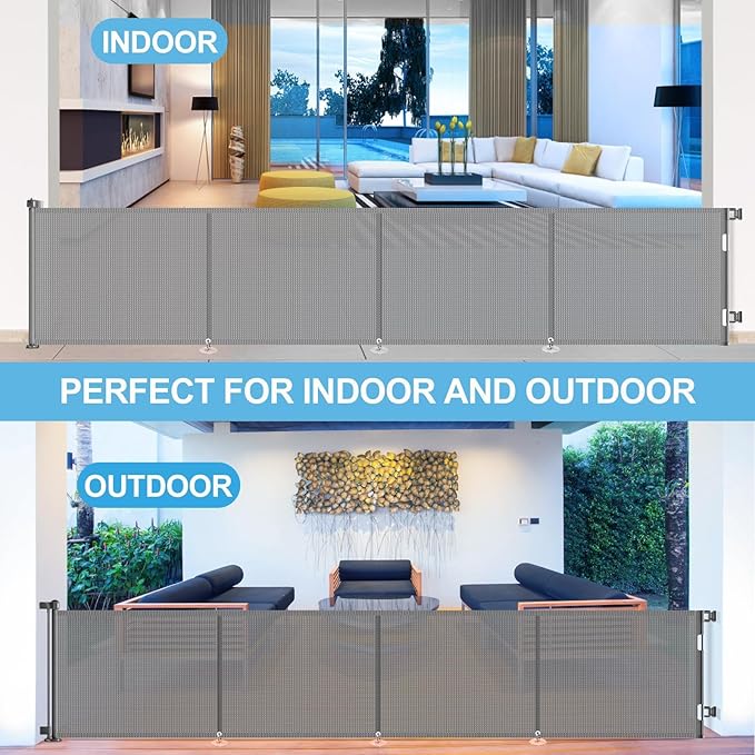 - Suitable for Indoor and Outdoor: Our retractable baby & dog gate can be installed on stairs, doorways, hallways, kitchens, decks, porches, garages, top and bottom of corridors, indoor and outdoor, and even extra-wide dog gates for the house. It's perfect for keeping children and pets safe, giving a large space for your little one to play, free mom’s hand. With this stair gate, you can have peace of mind knowing that your child or pet is always safety!