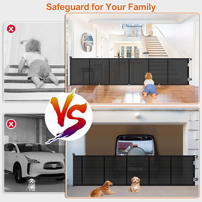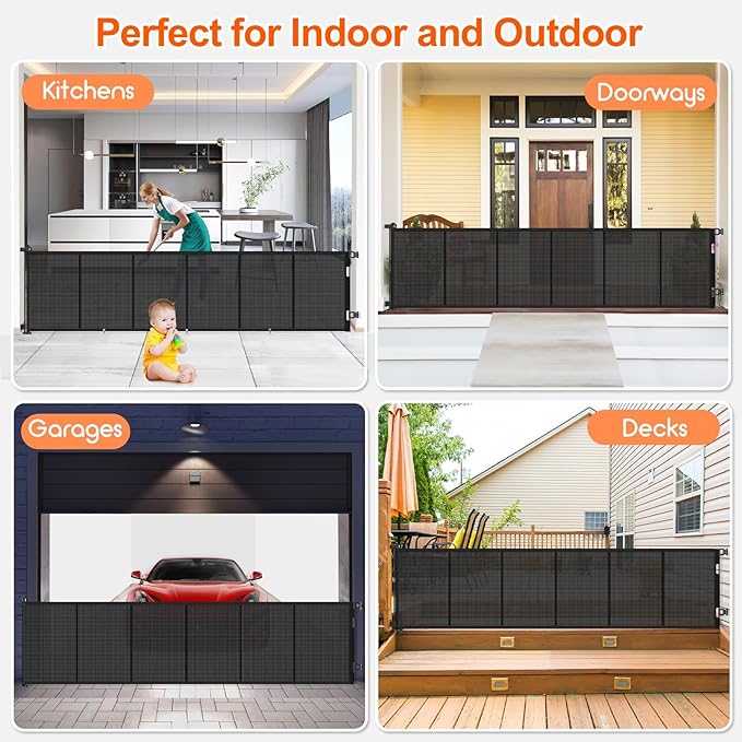 - Suitable for Indoor and Outdoor: Our retractable baby & dog gate can be installed on stairs, doorways, hallways, kitchens, decks, porches, garages, top and bottom of corridors, indoor and outdoor, and even extra-wide dog gates for the house. It's perfect for keeping children and pets safe, giving a large space for your little one to play, free mom’s hand. With this stair gate, you can have peace of mind knowing that your child or pet is always safety!