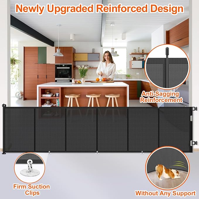 - Upgraded Safety Reinforced Design: Unlike most retractable gates on the market, our new upgraded dog gates for doorways reinforced with 5 fiberglass rods and 2 metal pull rings, effectively prevent babies and dogs from crawling under the mesh gate. This baby gates can be used as an infant gate and a pet gate, providing a safe, closed off environment to play for your curious crawlers, keeping them away from dangers.