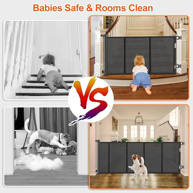 - Upgraded Safety Reinforced Design: Unlike most retractable gates on the market, our new upgraded dog gates for doorways reinforced with 6 fiberglass rods and 2 metal pull rings, effectively prevent babies and dogs from crawling under the mesh gate. This baby gates can be used as an infant gate and a pet gate, providing a safe, closed off environment to play for your curious crawlers, keeping them away from dangers.
