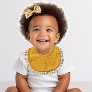 - Product Material: 100% High Quality Muslin Cotton with Lace accent and nylon headband on bows. Absorbent Muslin will keep the baby dry and comfortable from drooling or eating messes. All items in the set are breathable and lightweight and will be super soft on baby’s gentle skin. Due to the lace accent, hand washing is recommended.
