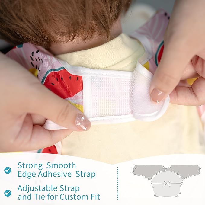 - 【Secure and Comfortable】 - Specially designed with an extra long and strong adhesive strap around the neck, and a tie around the waist, all edges are smooth to ensures a secure and custom fit, and without the possible discomfort around the neck. The non-snug elasticized cuff helps prevent food from getting up the sleeves.