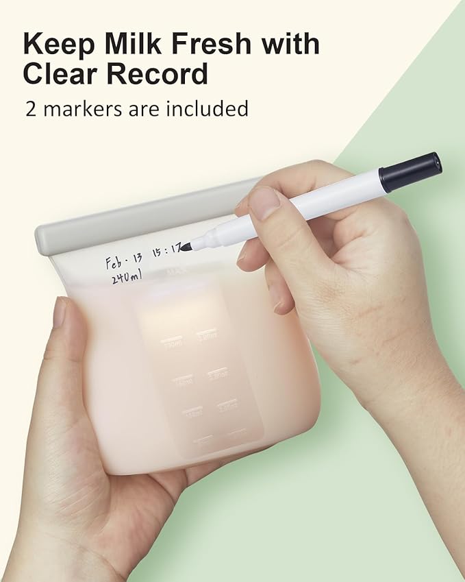 - Generous Capacity & Easy Monitoring - Lictin milk storing bag comes in a set of 5, with each bag capable of holding 8.5oz/250ml of breast milk. Its transparent shell allows for easy visual monitoring, and the scale on the bag helps track the volume. We also offers 2 extra marker pens, allowing you to record the time and date to avoid accidental consumption of expired milk