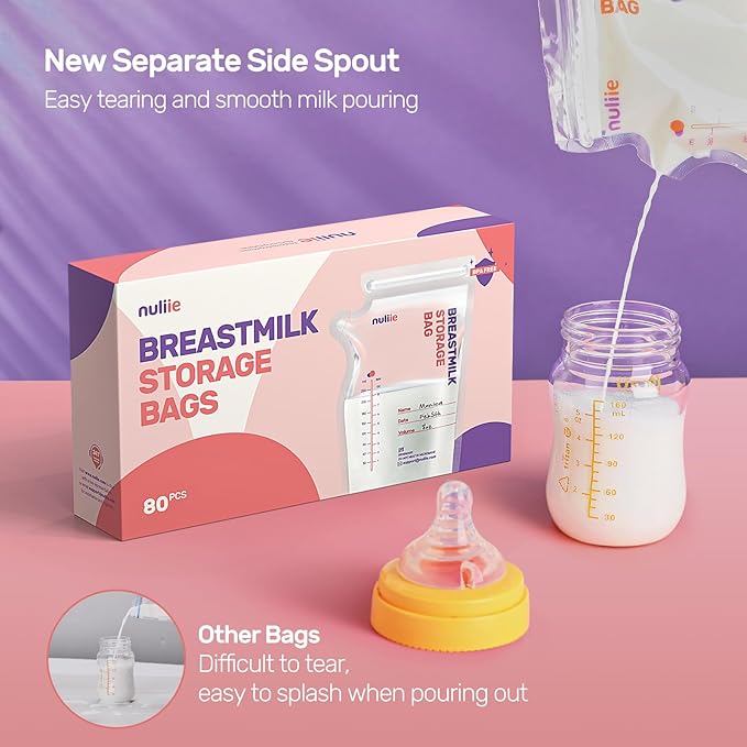 - INNOVATIVE SIDE SPOUT: Nuliie breast milk storage bags combine style with practicality. Our unique pour spout design allows users to pour milk directly, eliminating the risk of secondary pollution. Unlike traditional pouring through the sealing strip, mothers can effortlessly tear the small zipper of the spout, ensuring a spill-free and straightforward pouring experience without compromising the purity of the breast milk.