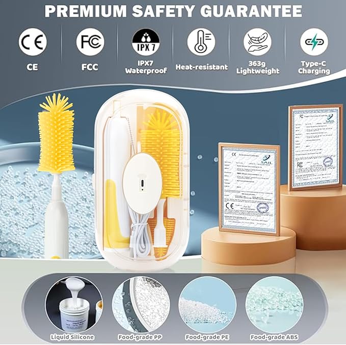 - Why Choose Our 6-in-1 Kit? ✅ All tools in one set—no more buying separate brushes ✅ Electric power = less scrubbing, more time with baby ✅ Food-grade, durable materials = safe for long-term use ✅ Rechargeable + waterproof = convenient for daily/ travel use ✅ Ideal gift for baby showers, new parents, or registry must-haves Make baby bottle cleaning simple, safe, and stress-free. Add our 6-in-1 Electric Bottle Brush Kit to your cart today!