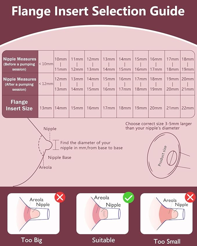 - 【Multiple Sizes to Choose】:Our flange inserts are available in 10 sizes-13//14/15/16/17/18/19/20/21/22mm to accommodate the dynamic needs of mothers throughout their breastfeeding journey. ou can easily find the perfect flange fit within all sizes,Correct size flange inserts help moms pump more comfortably and efficiently.