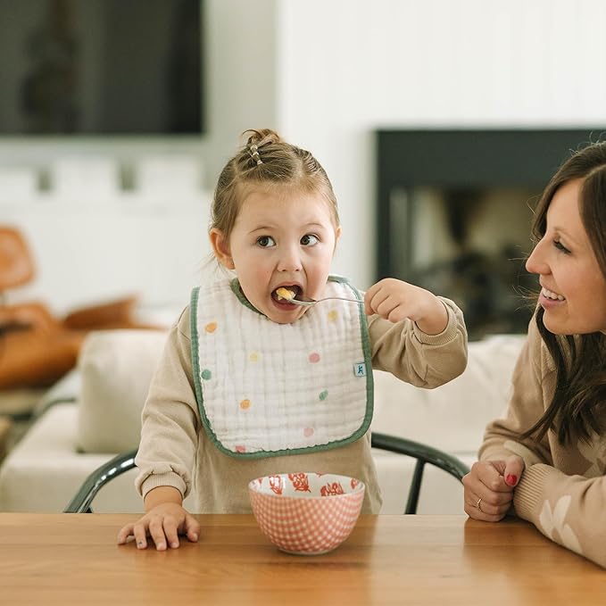 - MEALTIME DROOL CATCHER: We make our bibs with 3 layers of highly absorbent, 100% cotton muslin. The thickness of these layers helps soak up Baby’s drooling and absorb spills, while keeping food off the baby during breakfast, lunch, and dinner.