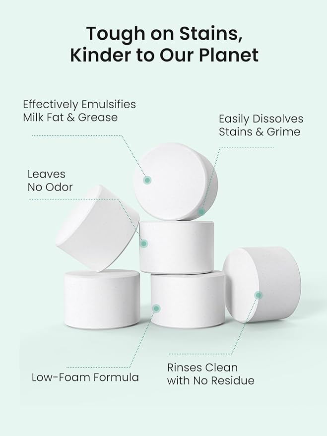 - Multi-Purpose Cleaning: Specially designed for all bottle washer machines, these tablets deliver powerful cleaning for your babyโs bottles, pump parts, and other essentials. Our gentle and effective natural enzyme formula is designed with the environment in mind, ensuring no harmful chemical residues are left behind.
