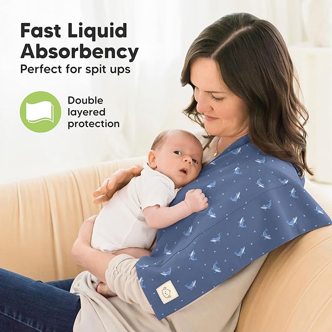 - Super Absorbent, Catches Liquid Well - These burping cloths for babies sits on your shoulder comfortably, and the thick organic cotton catches rolling liquid and spit ups well.