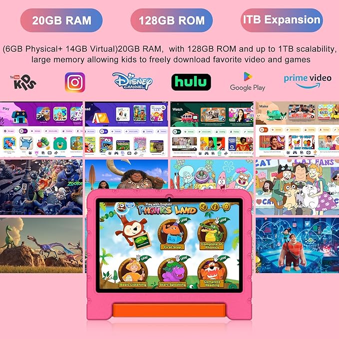 - 【20GB (6+14) RAM and 128GB Super ROM & 6000mAh Large Capacity Battery】 20GB ( 6GB Original + 14GB Expanded Virtual ) RAM + 128GB ROM (SD card expandable up to 1TB), it is able to run various apps compatibly and smoothly, and store your child's favorite movies, photos and apps, such as Kindle,Instagram,Disney+ and other daily required apps directly from the pre-installed play store to meet your child's diverse learning and entertainment needs. Let kids enjoy math, language, music, painting in the game. Equipped with a large 6000mAh battery, giving your child a stable and continuous use experience.