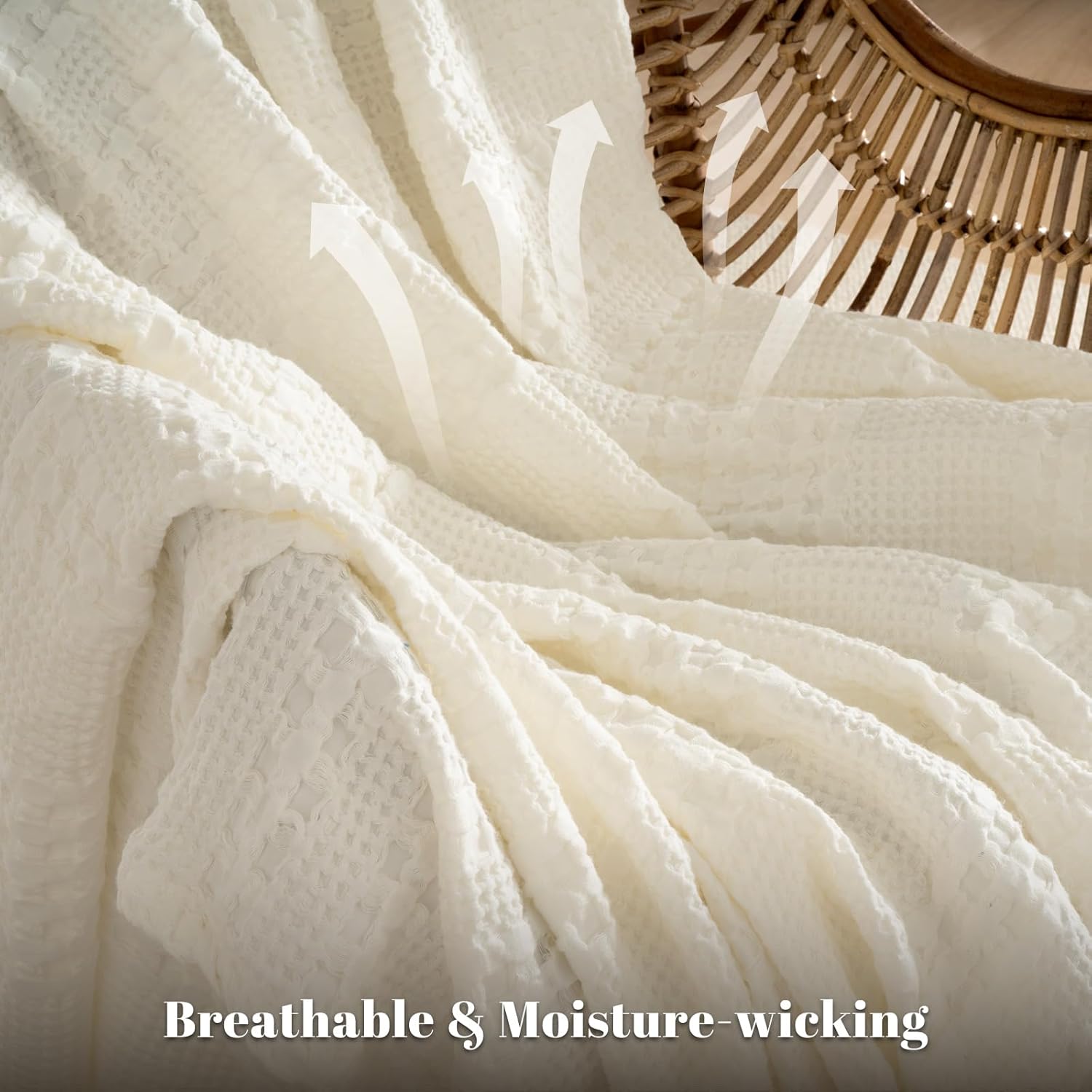 PHF 100% Cotton Waffle Weave Blanket Queen Size, Soft Lightweight Breathable Cozy Summer Blankets for Bed, Luxury Aesthetic Woven Bedding for Home Decor, 90"x90", Ivory