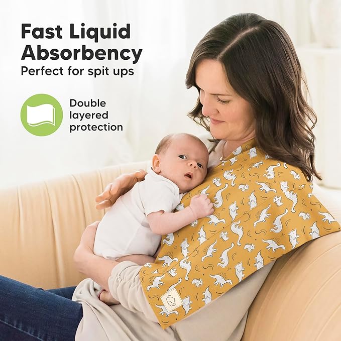 - Super Absorbent, Catches Liquid Well - These burping cloths for babies sits on your shoulder comfortably, and the thick organic cotton catches rolling liquid and spit ups well.