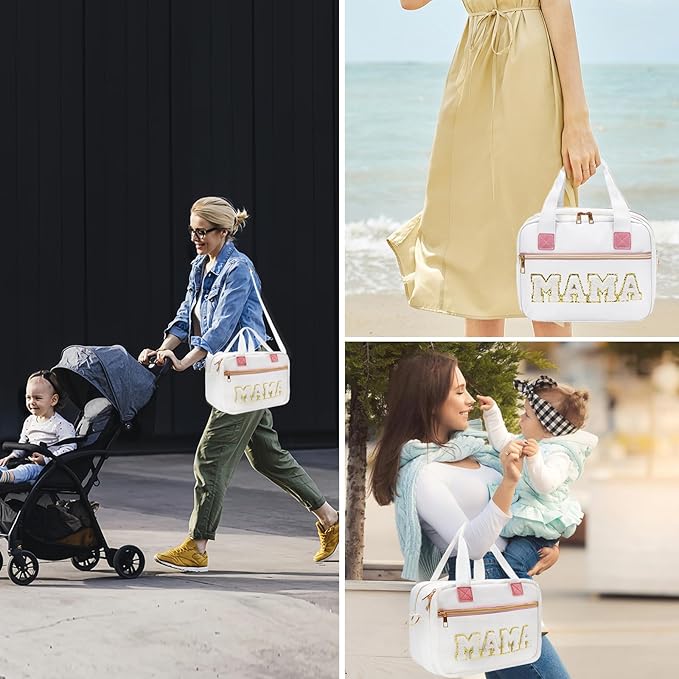 - MULTI POCKETS DESIGN: The handle bag with chenille letters mama looks very elegant. Front section with 2 padded elastic pouches to keep wearable breast pump safe and in place. The wearable pump bag also designed a mesh zipper pocket in front section for storing power cords, charger & small items, and a front zipper pocket for phone storage.