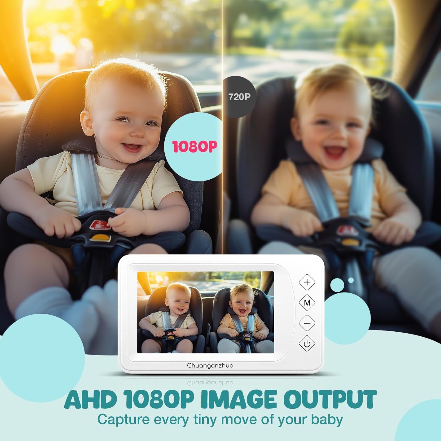 - ă5" AHD 1080P IPS Full-View MonitorăThe 5-inch perfect size: bigger view than 4.3", neater than 7''. Our IPS full-view car baby monitor delivers clear, accurate images from any angle. Whether you're in the driver's or passenger seat, you'll enjoy an identical viewing experience. This AHD 1080P monitor with high pixel density precisely reproduces colors and contrasts, offering rich gradations, sharp light-dark differentiation, and vivid images to capture your baby's every movement