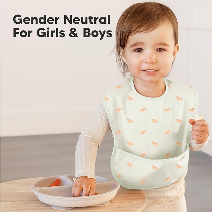 - Covers Upper Chest and Shoulders - Your baby can now enjoy self-feeding without soiling their clothes with the mess-proof bibs. This toddler bib for baby boys and girls comes with a wide food catcher pocket holds fallen food crumbs and purée spills.