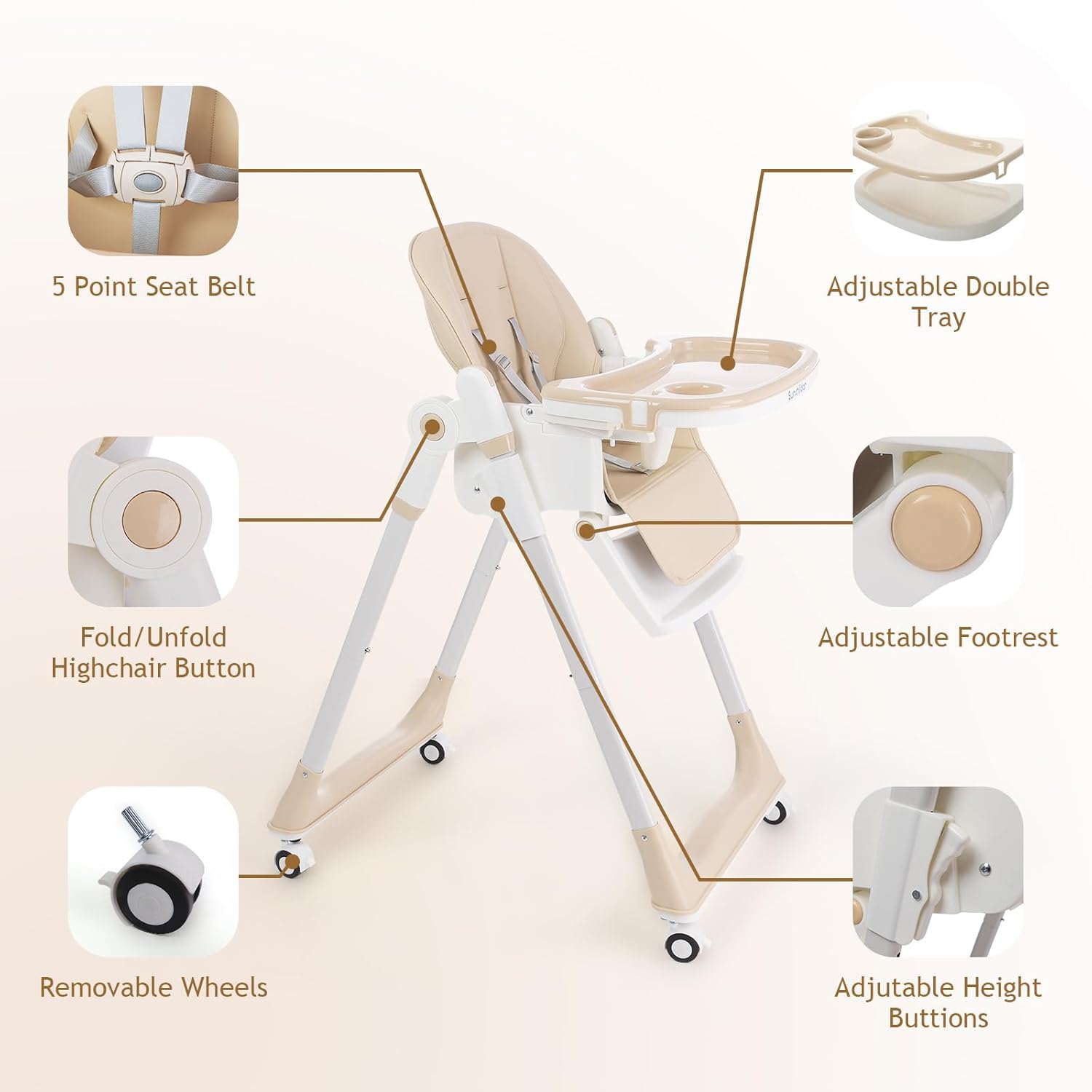 3 in 1 Baby High Chair with Wheels, Adjustable 5 Point Harness, Tray, Foot Rest, Backrest and Seat Height, Foldable High Chair for Toddlers, Beige