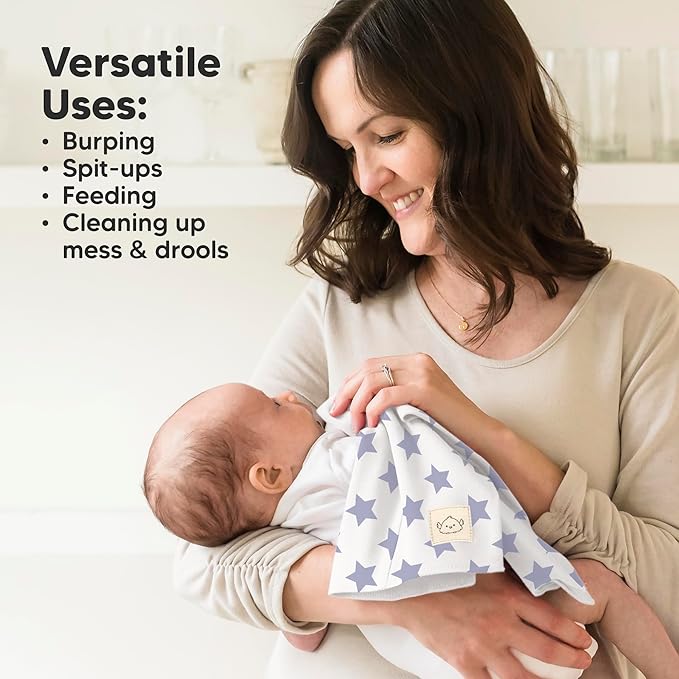 - Super Absorbent, Catches Liquid Well - These burping cloths for babies sits on your shoulder comfortably, and the thick organic cotton catches rolling liquid and spit ups well.