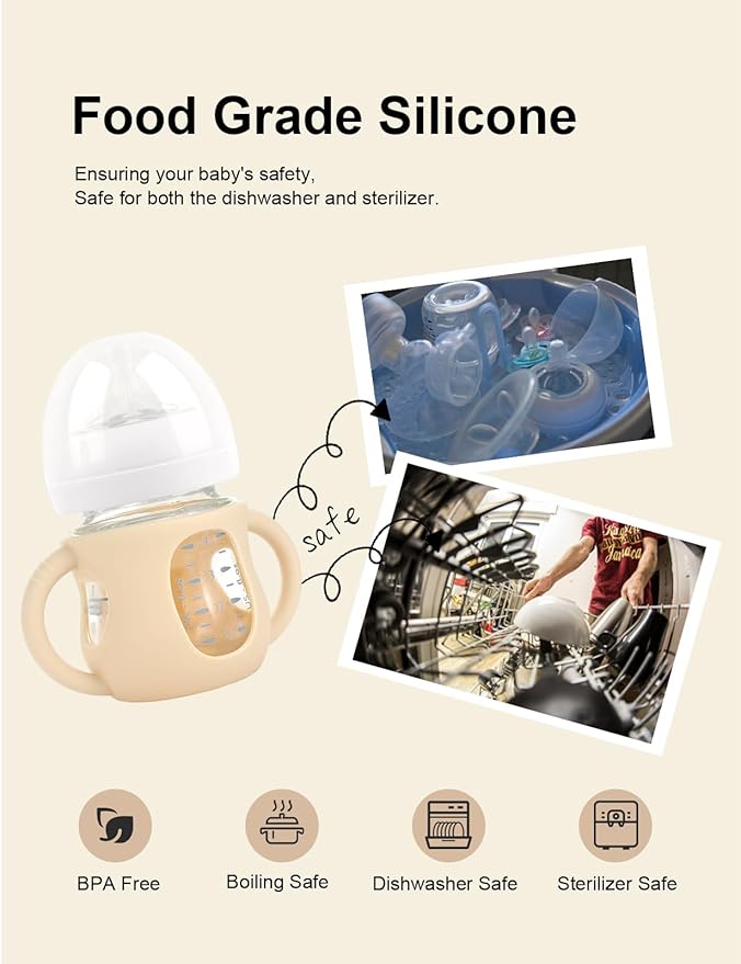 - Easy to Hold: Designed with easy-grip handles, this sleeve helps babies hold their glass bottles securely, reducing the risk of drops. Even if it falls from the dining table, bed, or sofa, it provides excellent protection. It also encourages your baby to learn self-feeding more quickly.
