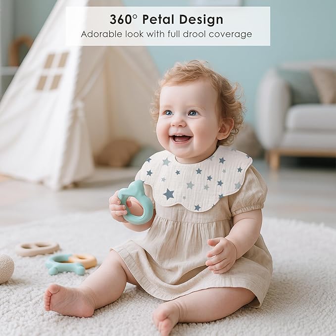 - 360° Rotating Petal Design:Features a unique flower-shaped baby drool bib that rotates freely for even wear, crafted from soft muslin fabric for maximum comfort. The cute flower shape adds a lovely touch to the baby's clothes