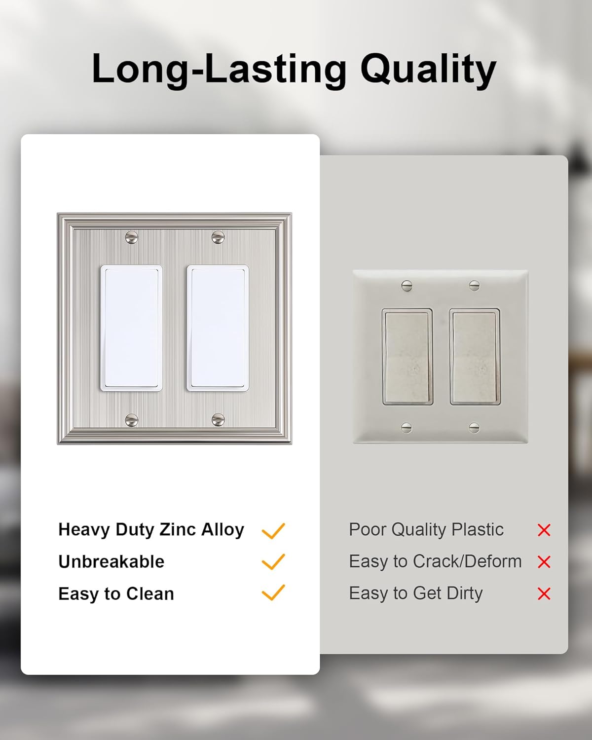 - Durable Solid Zinc Alloy - Constructed from thick and sturdy zinc alloy, the double switch plate covers offers exceptional durability and sturdiness, easier to clean and maintain. It is resistant to high impact, tarnishing, and corrosion, unbreakable. Ensuring it remains its stunning appearance for years to come.