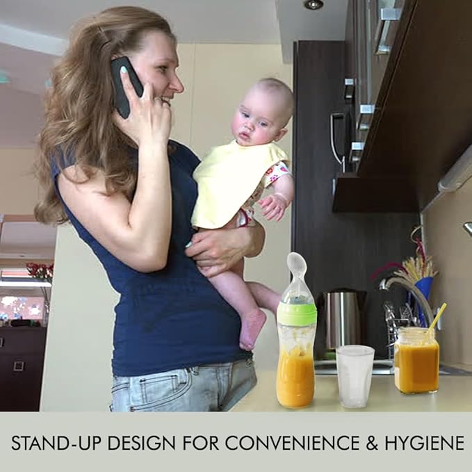 - STAND-UP SILICONE SPOON FEEDER MAKES BABY FEEDING A BREEZE - For ages 4 months and up, this all-in-one feeder makes it a lot easier to feed a fussy baby - Stand-up design for convenience and hygiene - Spillage proof squeezable silicone bottle with scale - Soft silicone spoon soothes teething pain.