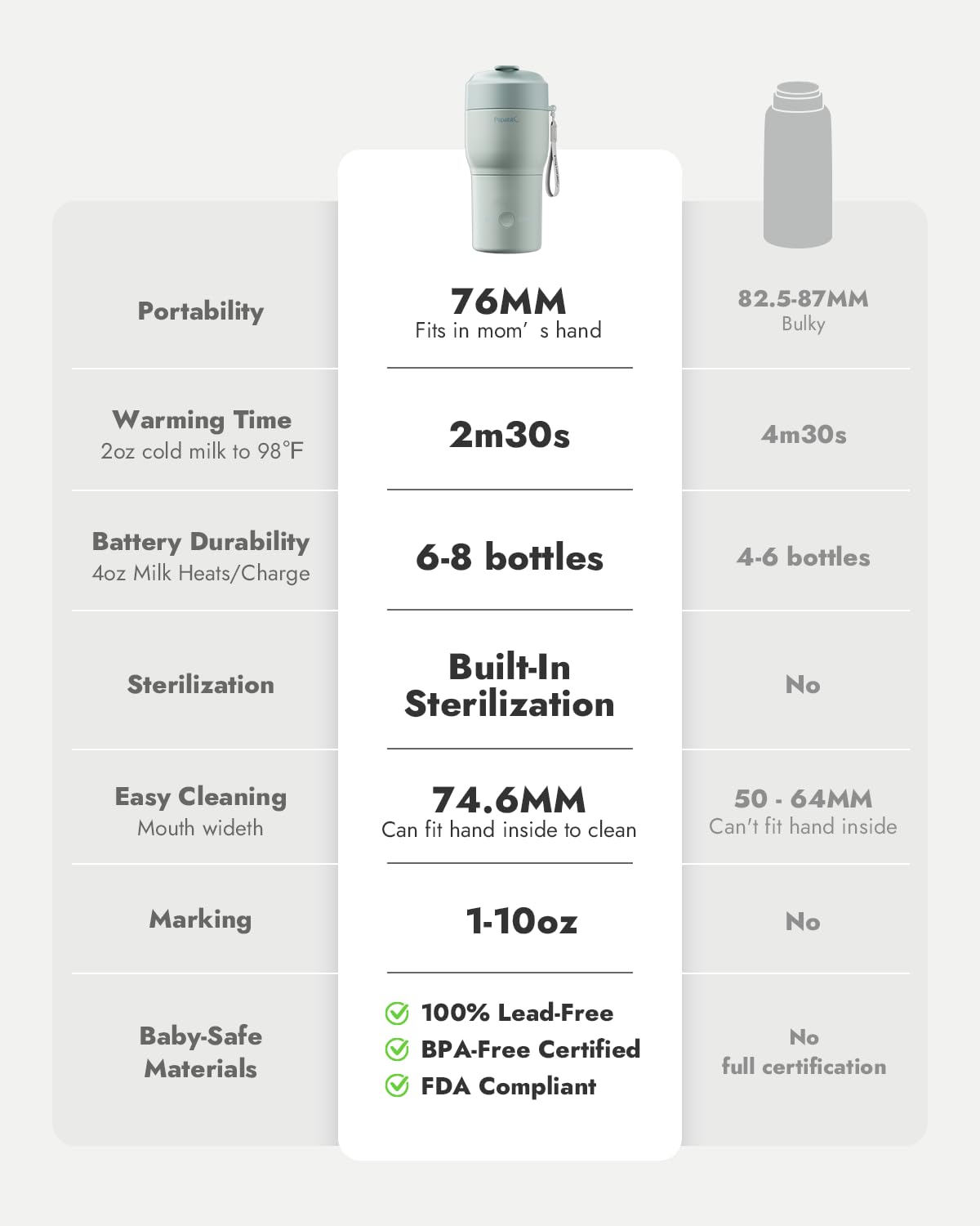 - Built-in Sterilizer & Safe Materials: The world's FIRST portable milk warmer with built-in sterilizer, helps maintain hygiene without extra tools. The warming chamber is made of FDA-compliant food-grade stainless steel — safe for breastmilk/ formula.