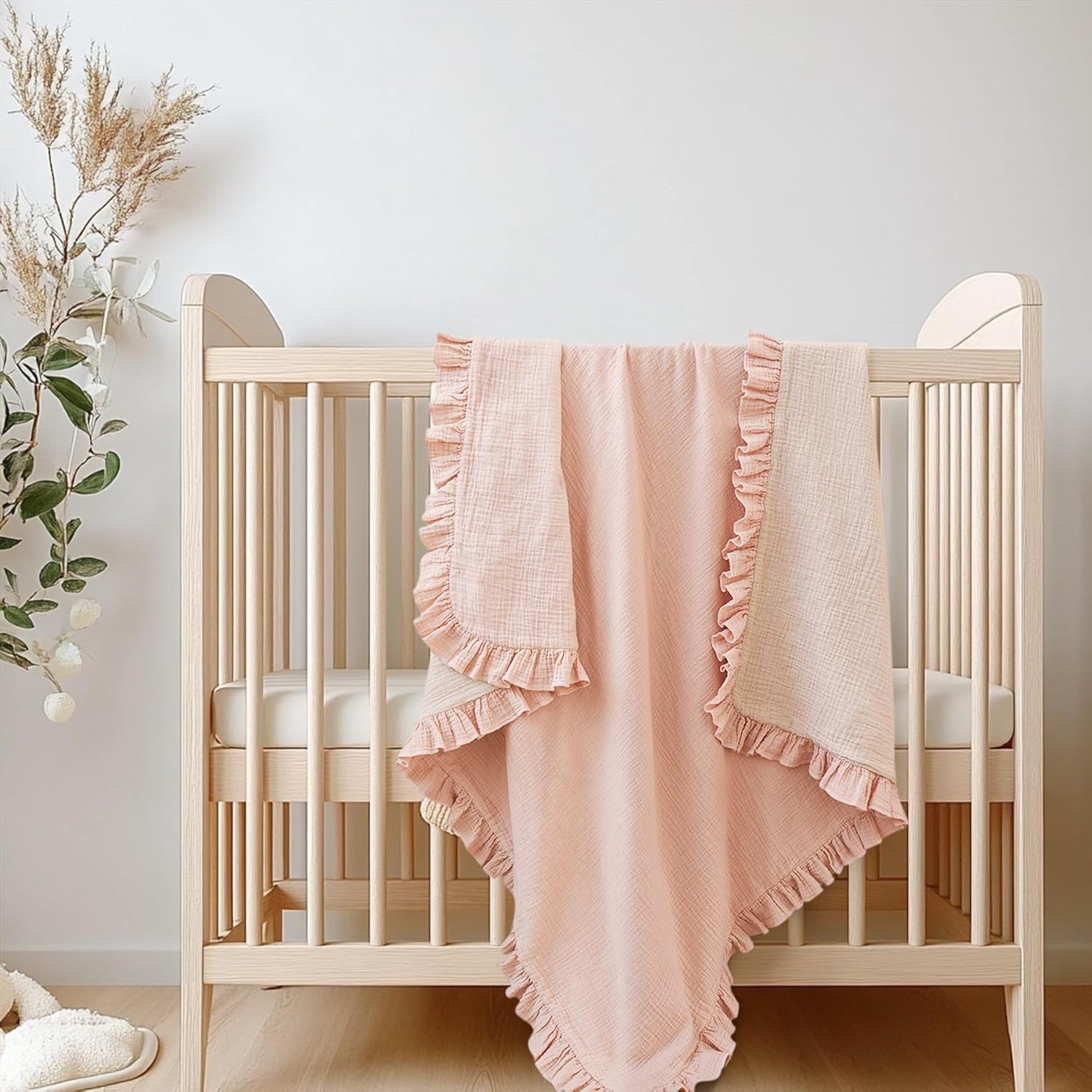 Konssy Flounce Muslin Baby Blankets, Cotton Crib Blanket for Baby Infant Toddler, Super Soft and Lightweight Nursery Blankets 40"x36" (Pink)