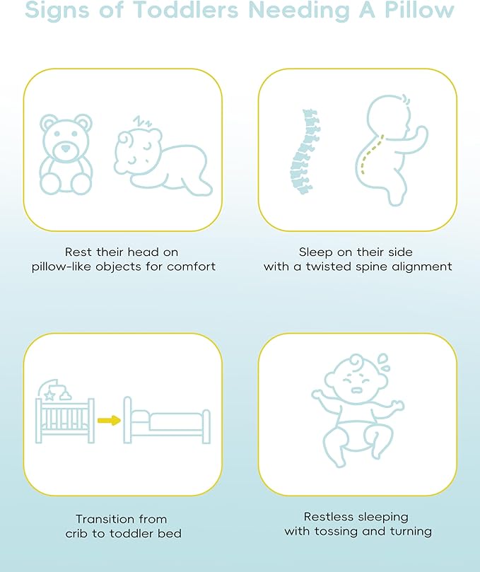 - Adjustable for Growing Toddlers: Our toddler bed pillow features two different thickness memory foam inserts, you can use one or both inserts to make sure the pillow is the right height for your little ones. For toddlers with developing bodies, it is essential that their pillow can adapt to their changing needs, promoting healthy spine growth. Adding our pillow to the sleep routine, adjust the inserts when needed so it will always be a perfect fit.